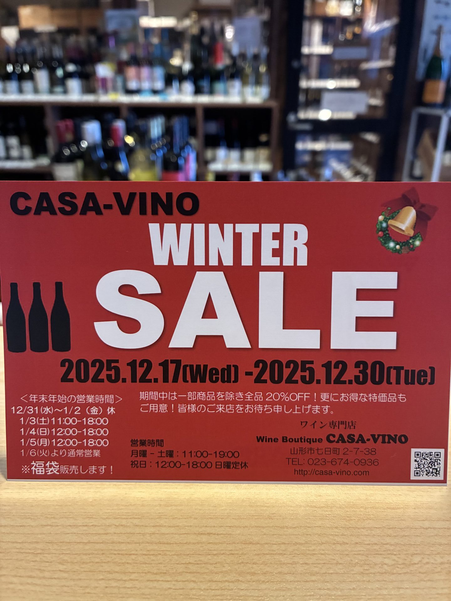WINTER SALEを開催致します。 セール期間:2025年12月17日(水)- 12月30日(火)※日曜定休 期間中は全品20%OFF!さらにお得な特価品を多数ご用意!(※県産ワインは除く) クリスマスや年末年始のご準備等に是非この機会をお役立て下さい。 皆様のご来店をお待ち申し上げます。